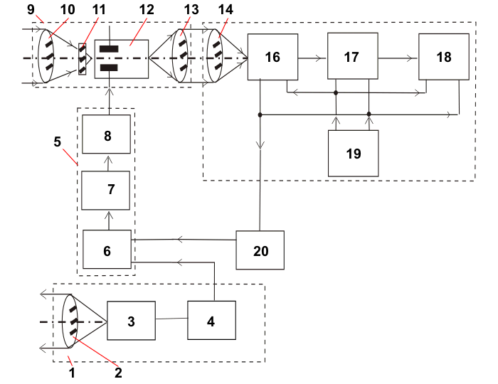 1 – èìïóëüñíûé ëàçåðíûé îñâåòèòåëü, 2 – îáúåêòèâ ôîðìèðîâàíèÿ èçëó÷åíèÿ, 3 – ÈËÏÈ, 4 – áëîê åãî íàêà÷êè (óñèëèòåëü òîêà íà ïîëóïðîâîäíèêîâûõ ýëåìåíòàõ), 5 – áëîê óïðàâëåíèÿ è ñèíõðîíèçàöèè, 6 – ÇÃÈ, 7 – ÁÐÇ, 8 – ÔÑÈ, 9 – áëîê íàáëþäåíèÿ, 10 – îáúåêòèâ, 11 – ïîëîñîâîé (èëè îòñåêàþùèé) ôèëüòð, 12 – èìïóëüñíûé ÝÎÏ, 13 – îêóëÿð (èëè ïåðâûé êîìïîíåíò îïòèêè ïåðåíîñà, åñëè èçîáðàæåíèå ââîäèòñÿ â ÒÂ-êàíàë), 14 – âòîðîé êîìïîíåíò îïòèêè ïåðåíîñà, 15 – ÒÂ-êàíàë, 16 – ïåðåäàþùàÿ ÒÂ-êàìåðà, 17 – âèäåîóñèëèòåëü, 18 – ÒÂ-ìîíèòîð, 19 – ñèíõðîãåíåðàòîð, 20 – áëîê äåëåíèÿ ÷àñòîòû ñòðîê.