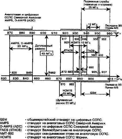 Сети GSM функционируют параллельно с существующими европейскими национальными сетями аналоговых ССПС стандартов NMT-900, TAGS, ETACS. Частотные планы ССПС, включая стандарт GSM, показаны на рис. 2.1.