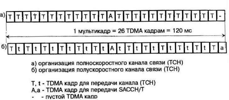 Для передачи каналов связи ТСН и совмещенных каналов управления FACCH и SACCH используется 26-кадровый мультикадр. Объединение каналов связи с полной и половинной скоростью с медленным совмещенным каналов управления SACCH показано на рис. 2.3. В полноскоростном канале связи в каждом 13-м TDMA кадре мультикадра передается пакет информации канала SACCH; каждый 26-й TDMA кадр мультикадра свободен. В полускоростном канале связи пакет информации канала SACCH передается в каждом 13-м и 26-м TDMA кадрах мультикадра.