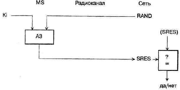 Процедура проверки сетью подлинности абонента реализуется следующим образом. Сеть передает случайный номер (RAND) на подвижную станцию. Подвижная станция определяет значение отклика (SRES), используя RAND, Ki и алгоритм A3: